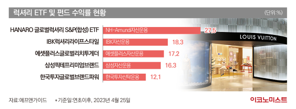 2020년 5월 12일 상장한 NH-Amundi자산운용의 HANARO 글로벌럭셔리S&P(합성) ETF는 ‘S&P Global Luxury Index’를 기초지수로 추종한다. 이 지수는 유럽, 미국, 캐나다 등 12개 국가에 상장된 럭셔리 관련 종목 중 80여개 종목에 투자하고 있다. 편입 종목은 루이비통을 보유한 프랑스 시가총액 1위 기업 루이비통모에헤네시(LVMH)를 비롯해 까르띠에·몽블랑의 리치몬트그룹, 에르메스, 메르세데스벤츠 등이다.