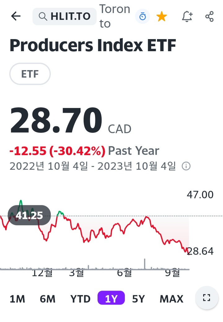 반면 캐나다 토론토 주식시장에서 거래되는 글로벌 리튬 ETF(HLIT.TO)시세를 보면 7월이후 확연한 하락추세를 보이고 있다.