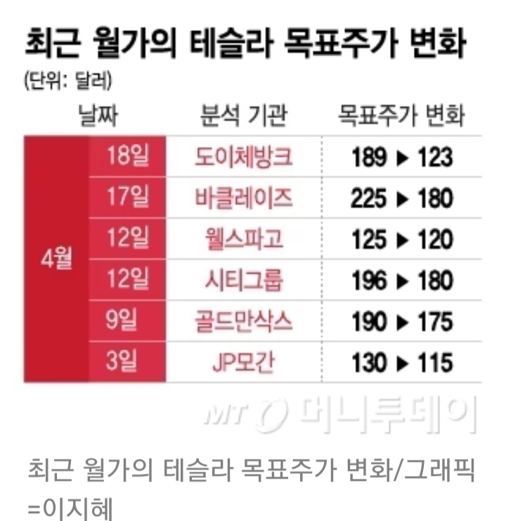 골드만삭스의 애널리스트인 마크 딜레이는 저가 모델 출시는 중장기적 성장 우려 완화에 도움이 될 것이라고 밝혔지만 차량 판매량과 로보택시 전망 등의 우려가 있다며 투자의견을 ‘중립’으로 유지했다.