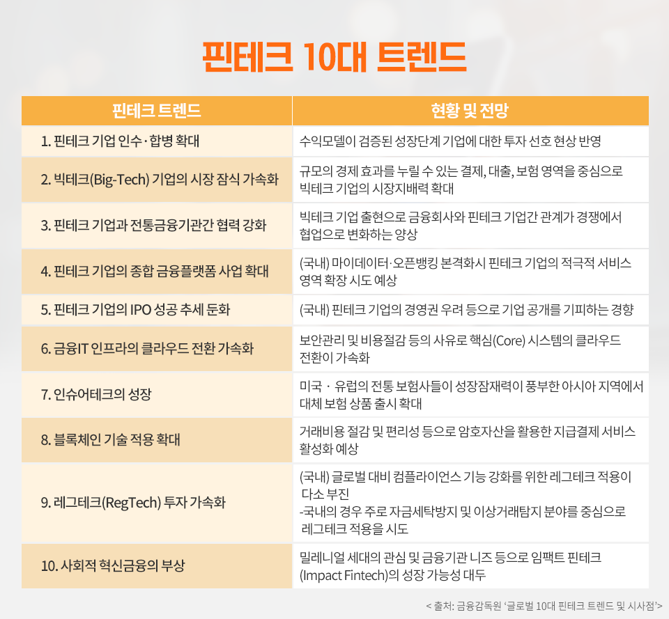 핀테크는 금융(Finance)과 기술(Technology)를 합성한 조어로서 IT 기술이 접목된 금융 서비스를 의미하며 한국의 핀테크 기업도 비교적 세계 수준에 근접하고 있다.