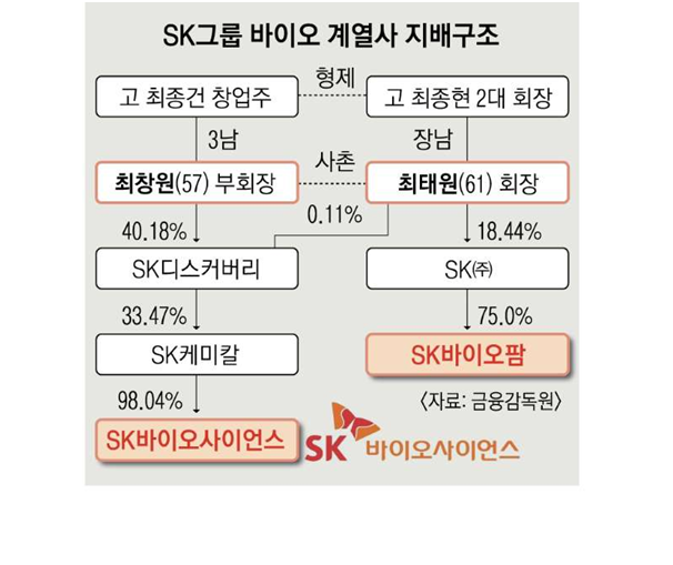 SK바이오사이언스 모기업은 지분 98.04%를 보유한 SK케미칼이고, SK케미칼은 SK디스커버리가 지배하고 있다.