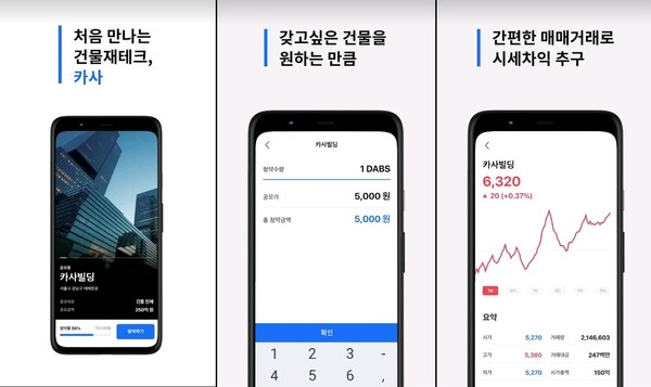 카사는 여러 건물의 수익을 관리하는 법인을 상장시키고, 상장법인에 투자 후 수익을 배당받는 공모 리츠와 달리 카사 플랫폼에 상장된 건물에 직접 투자 하는 구조다. 건물의 부동산관리처분신탁계약을 기반으로 발행된 댑스를 사고팔 수 있다.