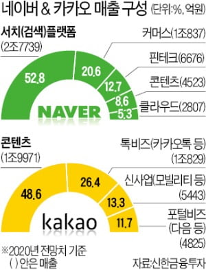 네이버는 수익의 상당 부분이 포털 광고에서 발생하는 데 비해 카카오는 핀테크 등 신성장 사업이 시가총액에서 차지하는 비중이 커지고 있다
